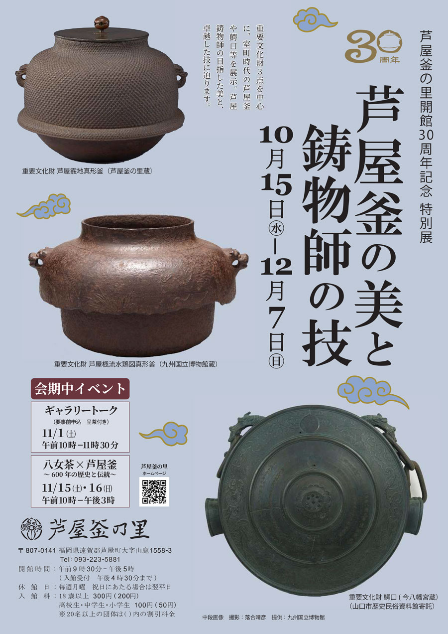 芦屋釜の復興を目的として平成7年に開館した芦屋釜の里は、本年で開館30周年を迎えます。それを記念して、芦屋鋳物師が製作した芦屋釜をはじめとする名品の数々を展示します。