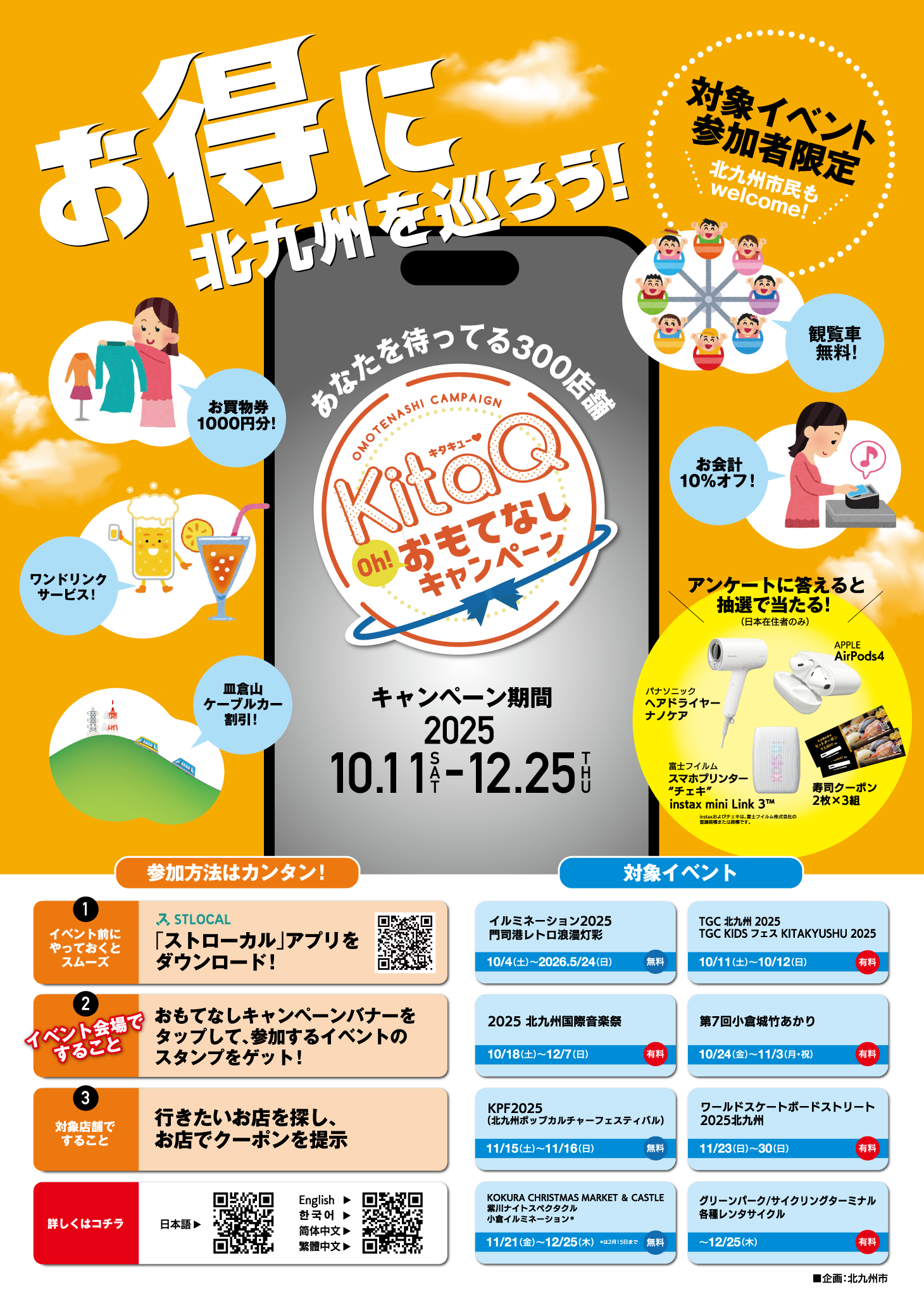 「THE OUTLETS KITAKYUSHUのお買い物券1,000円」や北九州の名店「田舎庵 小倉本店」「中華料理 耕治」等で受けられるサービスなど、北九州を訪れる観光客も、北九州市民も幸せになれるとてもおトクなキャンペーンです。