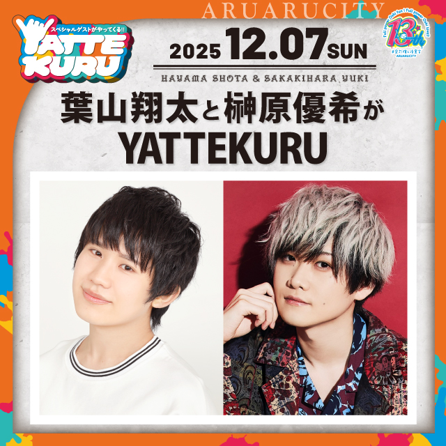 「ヒプノシスマイク -Division Rap Battle-」(波羅夷空却 役)・「ぶっちぎり?!」(刃暮達兎 役)などで人気の葉山翔太と、「ヒプノシスマイク -Division Rap Battle-」(四十物十四 役)・「あんさんぶるスターズ!!」(カンナ 役)などで人気の榊原優希が、あるあるCityにやって来ます!