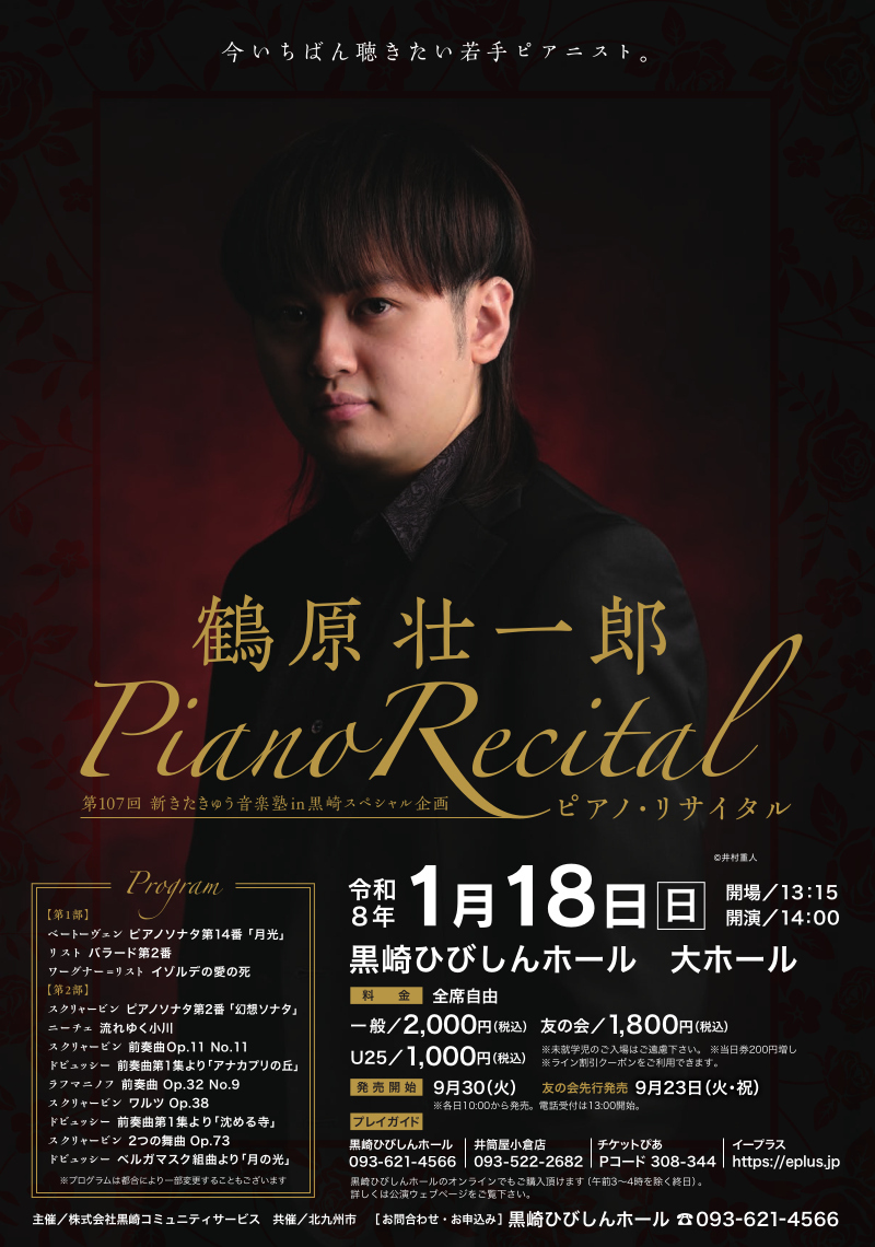 北九州市出身、今いちばん聴きたい若手ピアニスト 鶴原壮一郎のピアノ・リサイタル。