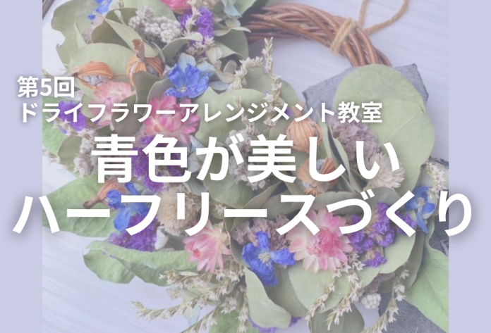 やさしい風合いのドライフラワーをたっぷり使い、鮮やかな青色が印象的な「デルフィニウム」を主役にした、ナチュラルテイストのハーフリースを作ります。