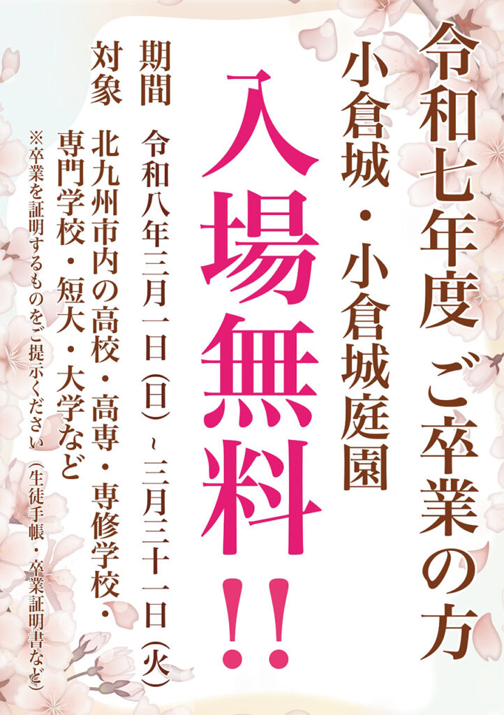 北九州市内の学校を今春卒業した人を対象に、卒業を証明するものの提示で小倉城天守閣と小倉城庭園の入場が無料に!